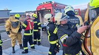 Im Fokus standen insbesondere die Personenrettung unter Atemschutz sowie die Brandbekämpfung im Innenangriff unter Berücksichtigung der speziellen Gefahren von Batteriespeicheranlagen. Im weiteren Übungsverlauf kam auch der Einsatz von Vollschutzanzügen zum Tragen.